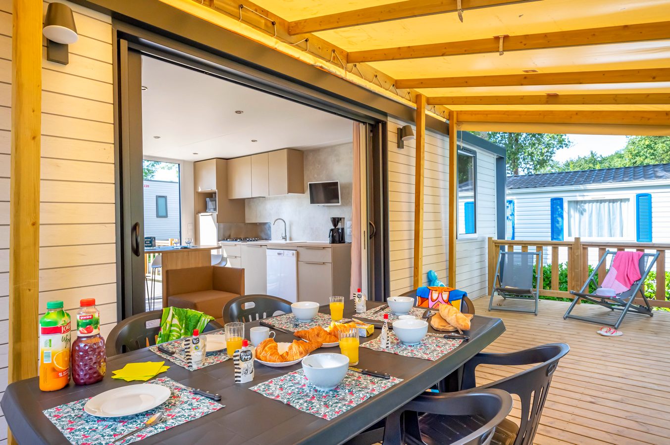 - Terrasse d’un mobil-home premium 6-8 personnes au cœur d’un camping avec piscine chauffée.