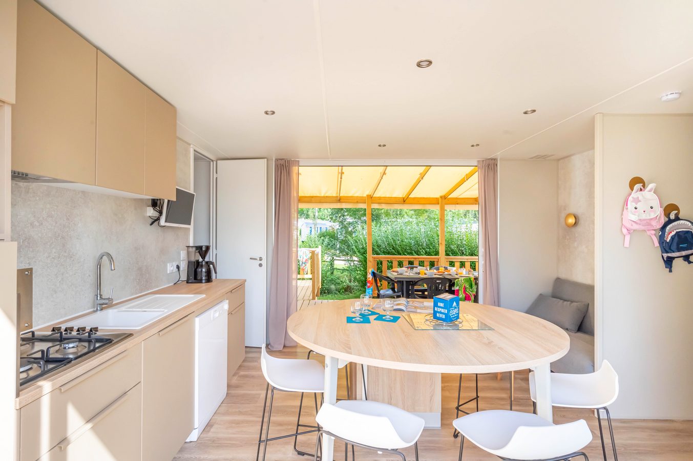 - Vu sur le salon et la cuisine équipé d’un cottage confort 6-8 personnes dans un camping très proche de la mer.
